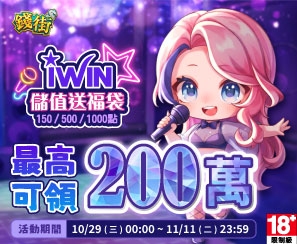 《錢街》10/29~11/11 儲iWIN指定面額150、500、1000可獲得超值福袋,最高可獲200萬c幣!
