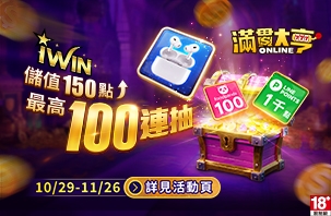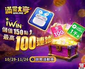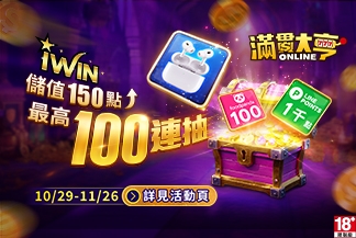 《滿貫大亨》10/29~11/26 儲值iWIN指定面額,即可獲得加贈禮包。