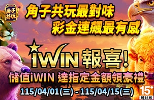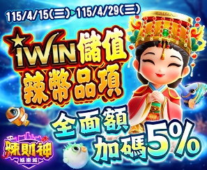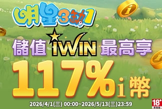 活動期間:115/4/1 ~ 115/5/13 活動內容:於活動期間使用iWIN儲值指定i幣品項,最高享117...