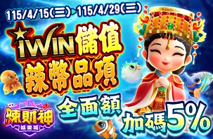 《辣財神》4/15~4/29 使用「iWIN」單筆儲值「所有辣幣品項」,除了原有回饋,活動額外加碼「5%」,最高可獲得「119%」辣幣!