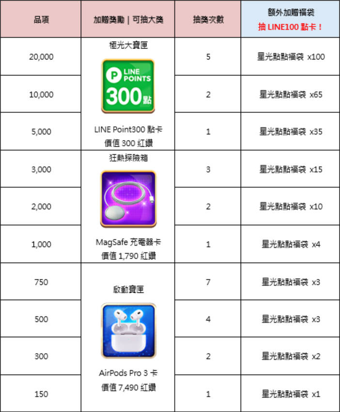 【啟動寶匣】使用後可隨機獲得指定遊戲虛寶卡或紅鑽獎勵,大獎LINE Point300點卡 。