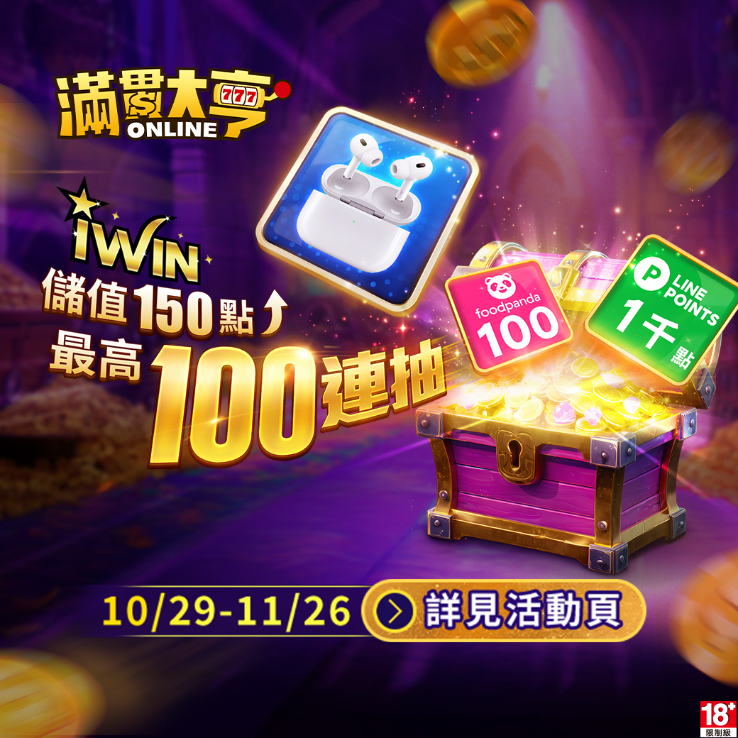 《滿貫大亨》10/29~11/26 儲值iWIN指定面額,即可獲得加贈禮包。